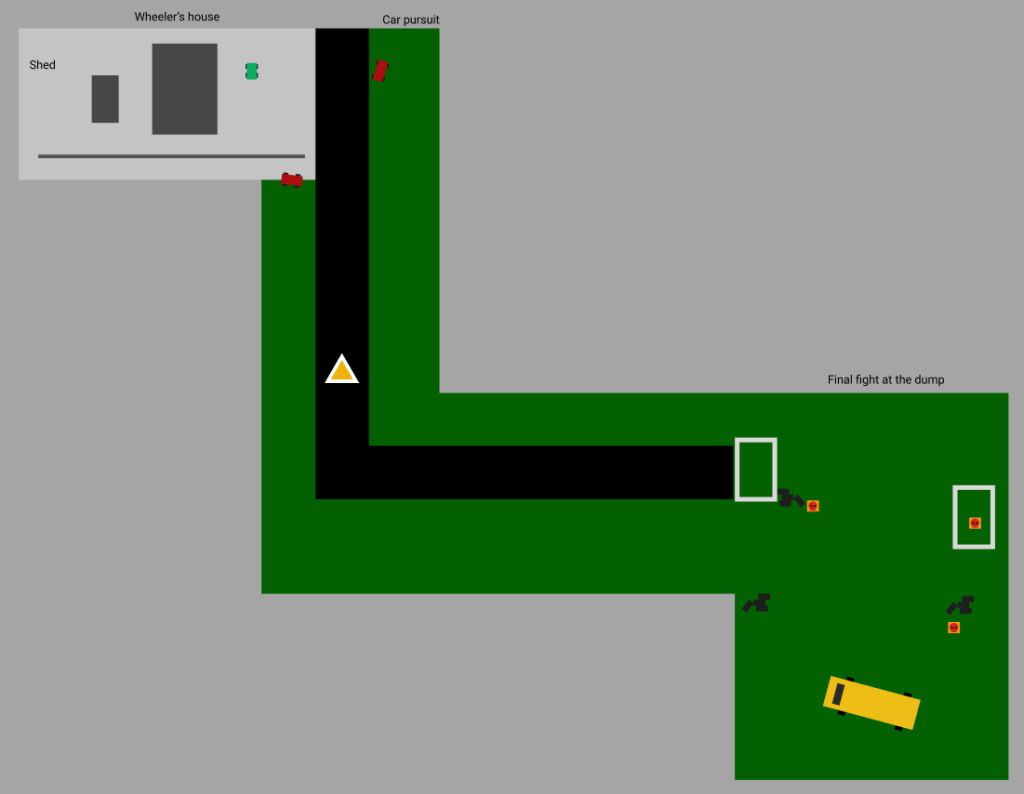 - Traversée d’une casse automobile, menant à un combat final opposant plusieurs vagues d’ennemis.