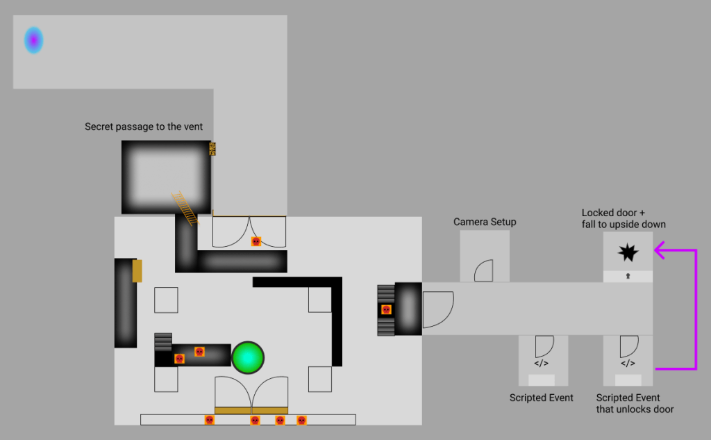 - Expérience de jeu : Créer une montée en tension progressive à travers des événements scriptés et un level design favorisant l’exploration, l’infiltration et l’action.